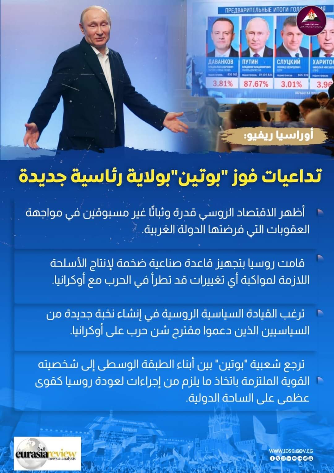 كشفت الصفحة الرسمية لمركز المعلومات ودعم اتخاذ القرار بمجلس الوزراء على موقع التواصل الاجتماعي "فيسبوك" عن تداعيات فوز بوتين بولاية رئاسية جديدة.