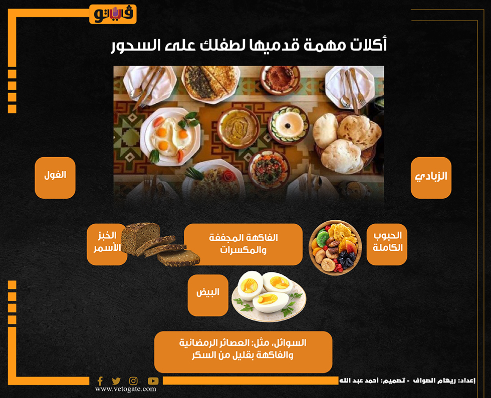 أكلات مهمة قدميها لطفلك على السحور (إنفوجراف) الأحد 24/مارس/2024 - 02:00 م 3/24/2024 2:00:44 PM صيام الأطفال، فيتو هبة شعيب شارك طباعة 18 حجم الخط شارك طباعة صيام الأطفال السحور أكلات مهمة قدميها لطفلك على السحور الدكتور تامر عبد الحميد صحة الصحة