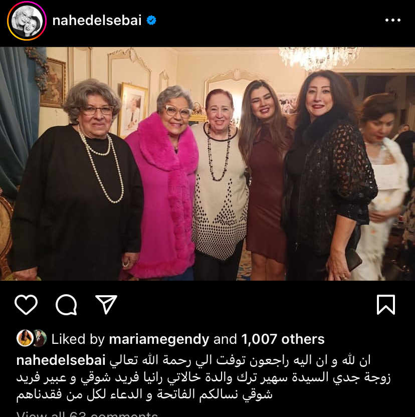 وكتبت ناهد السباعي قائلة: "إنا لله وإنا إليه راجعون توفيت إلى رحمة الله تعالي زوجة جدي السيدة سهير ترك.. والدة خالاتي رانيا فريد شوقي وعبير فريد شوقي.. نسألكم الفاتحة والدعاء لكل من فقدناهم".