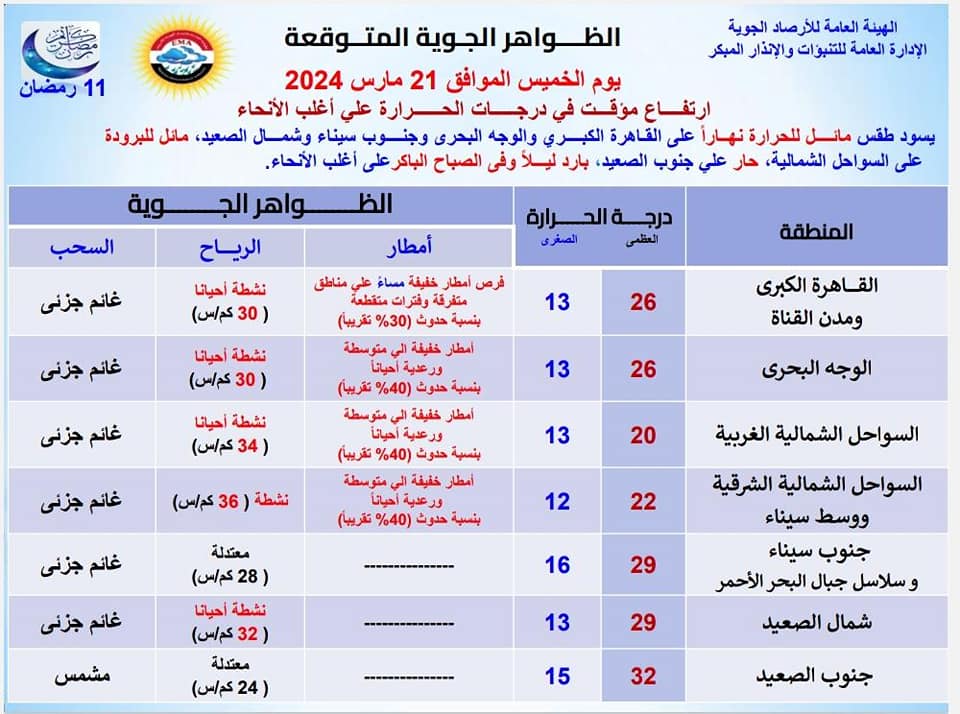 أعلنت هيئة الأرصاد الجوية، حالة الطقس اليوم الخميس 21 -3 -2021، محذرة من 3 ظواهر جوية متوقعة اليوم.