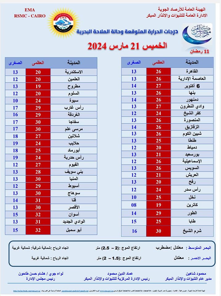 وتوقعت هيئة الأرصاد بارتفاع في درجات الحرارة على أغلب الأنحاء ليسود طقس مائل للحرارة نهارًا على القاهرة الكبرى والوجه البحري وجنوب سيناء وشمال الصعيد حار على جنوب الصعيد مائل للبرودة على السواحل الشمالية.
