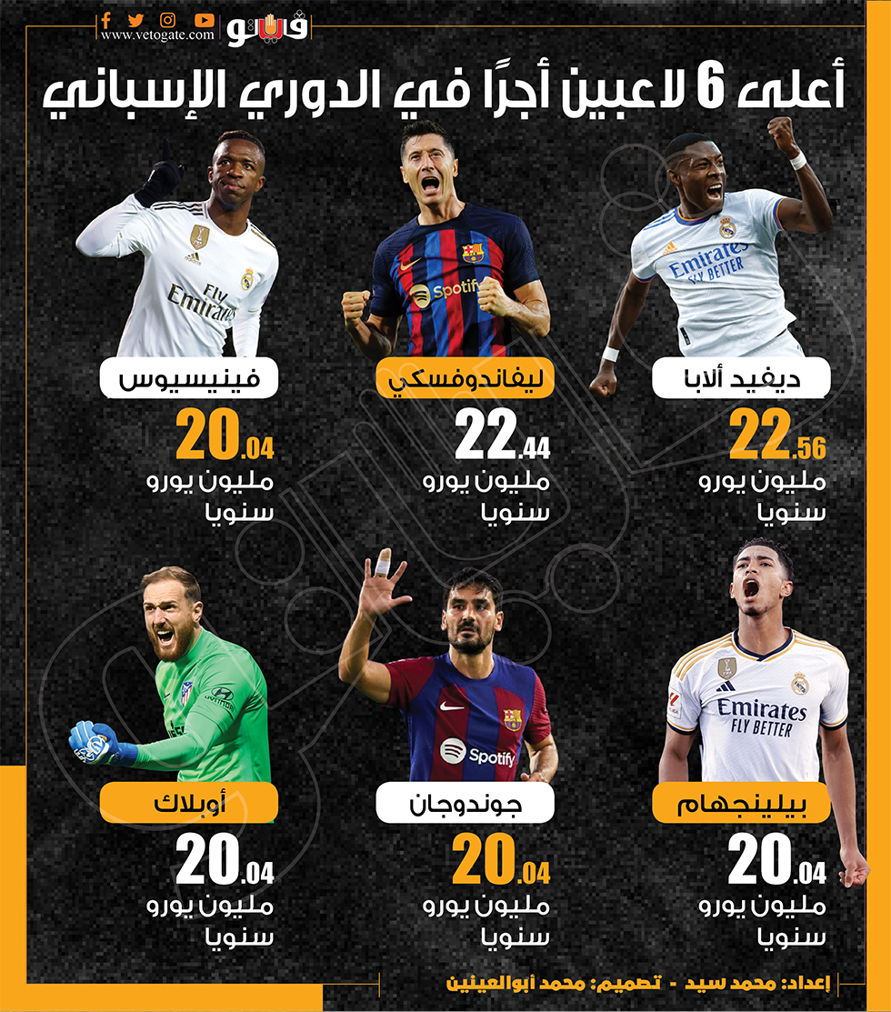 أعلى 6 لاعبين أجرًا في الدوري الإسباني (إنفوجراف) الجمعة 22/مارس/2024 - 08:46 م 3/22/2024 8:46:19 PM ديفيد ألابا، فيتو محمد سيد شارك طباعة 18 حجم الخط شارك طباعة الدوري الإسباني ألابا ليفاندوفسكي يان أوبلاك فينيسيوس بيلينجهام جوندوجان