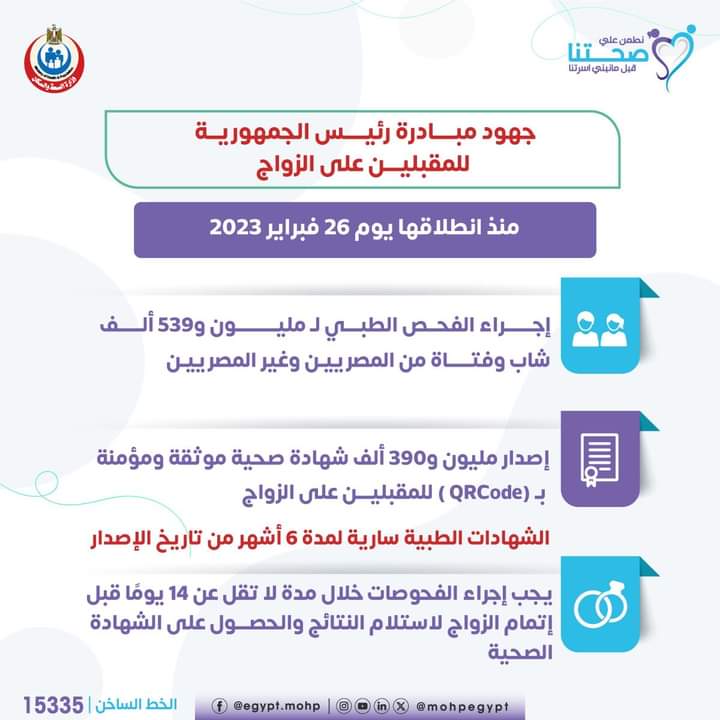 كشفت وزارة الصحة عن جهود مبادرة رئيس الجمهورية للمقبلين على الزواج، منذ انطلاقها في ٢٦ فبراير ٢٠٢٣ حتى الآن