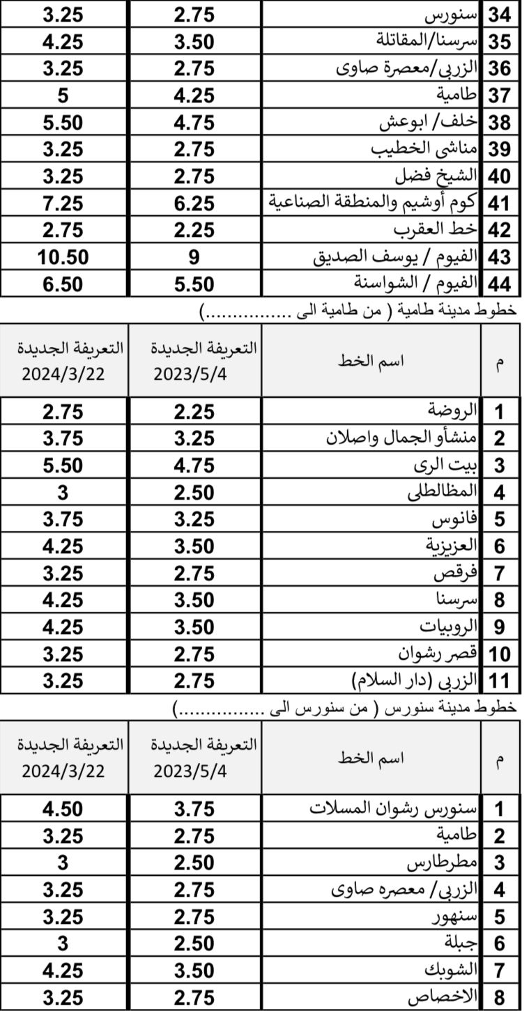 أعلن الدكتور أحمد الأنصاري محافظ الفيوم تعريفة الركوب الجديدة لخطوط سير السرفيس والتاكسي وسيارات الأجرة العاملة على الخطوط الداخلية والخارجية بين مراكز المحافظة، والمحافظات الأخرى، وذلك بعد إعلان لجنة التسعير التلقائي للمنتجات البترولية، تحريك أسعار البنزين والسولار، بدءًا من صباح اليوم الجمعة.