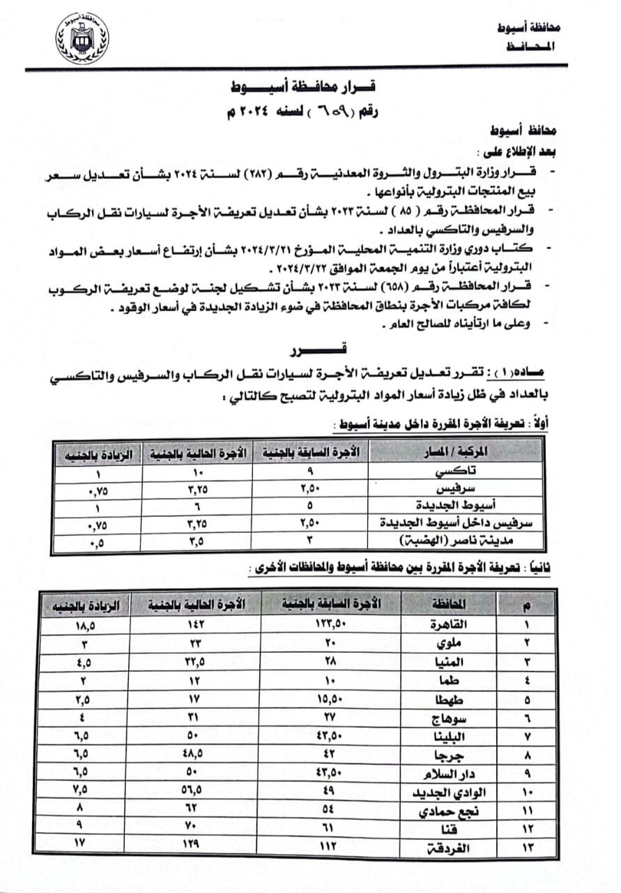 أصدر اللواء عصام سعد محافظ أسيوط قرار رقم 659 لسنة 2024 بتعديل تعريفة الأجرة للمواصلات الداخلية والخارجية وسيارات نقل الركاب السرفيس والتاكسي بالعداد داخل المحافظة وبين المراكز.