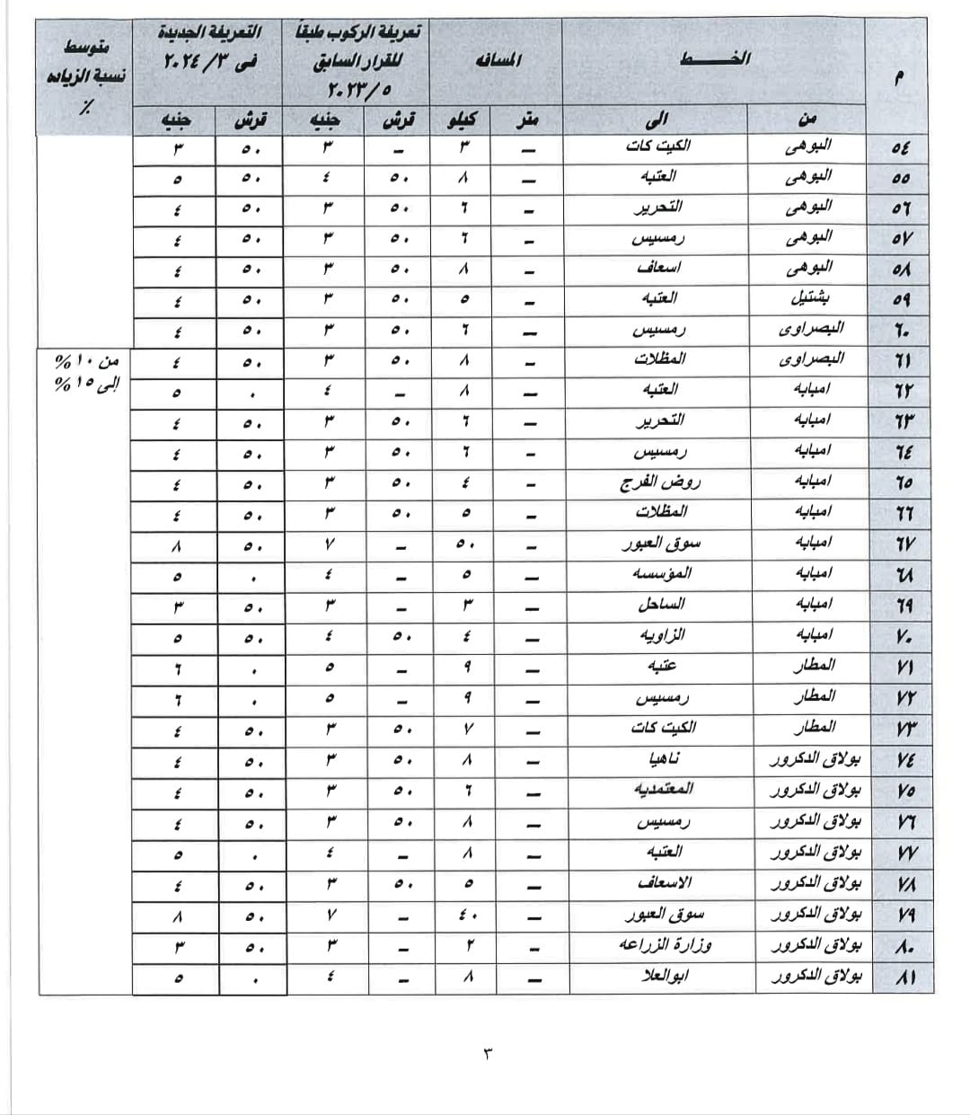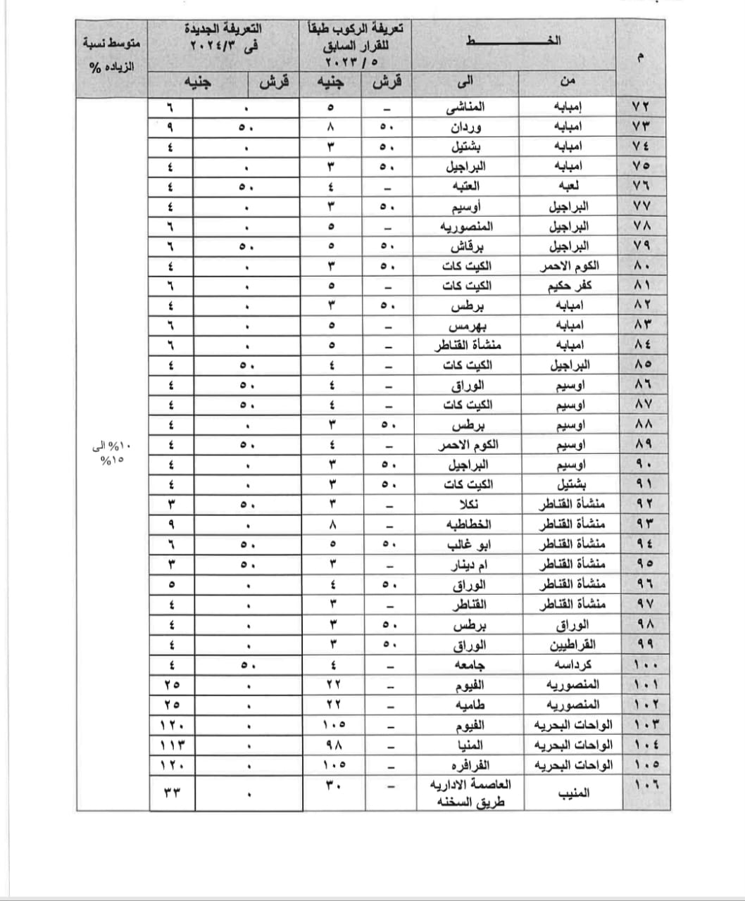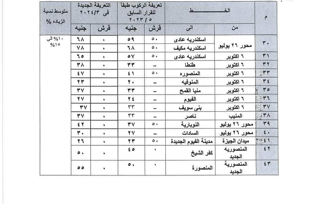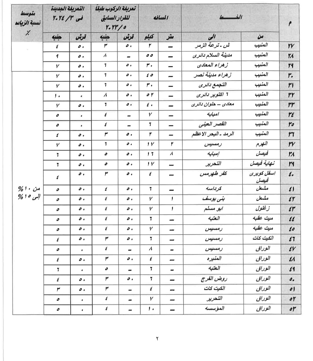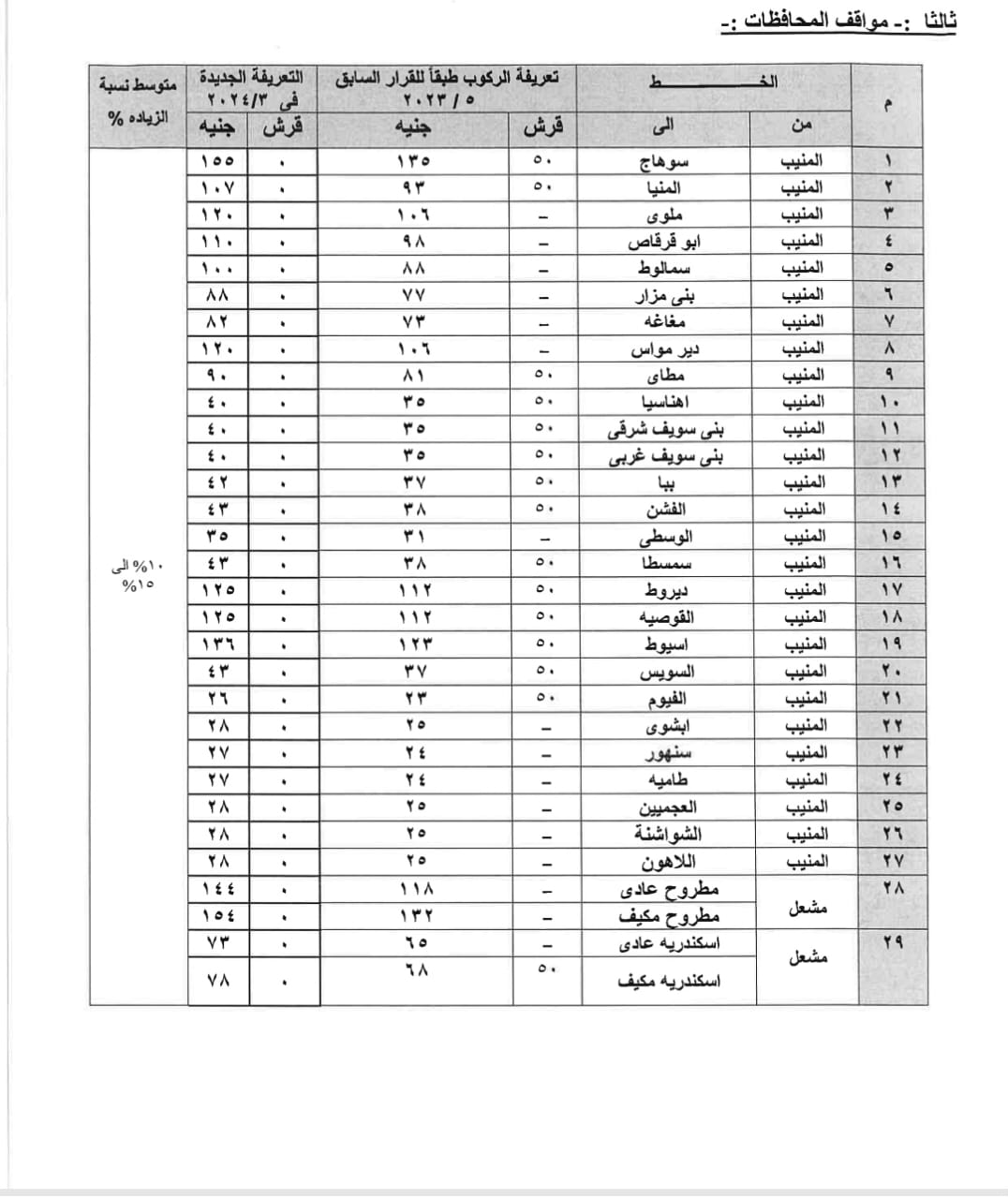 وأوضح اللواء أحمد راشد، أن اللجنة التي تم تشكيلها لتعديل تعريفة الركوب وضعت في اعتبارها مسافة كل خط سير وعدد الرحلات تحقيقًا للعدالة، مشيرًا إلى أن اللجنة استقرت على زيادة تعريفة تحديد أجرة السرفيس والمركبات طبقًا للزيادة الجديدة بمعدل يتراوح ما بين ١٠ الي 15 % .