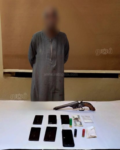 وجرى ضبط عاطل "له معلومات جنائية"- مقيم بدائرة مركز شرطة إسنا، وبحوزته 2 كيلو جرام لمخدر الحشيش- بندقية خرطوش وطلقة.