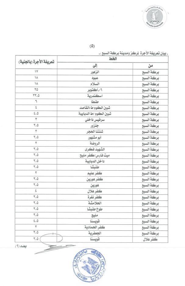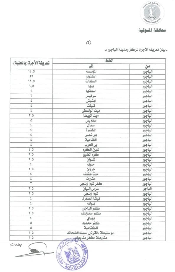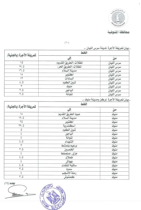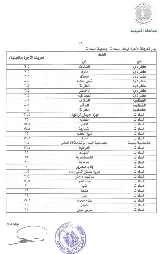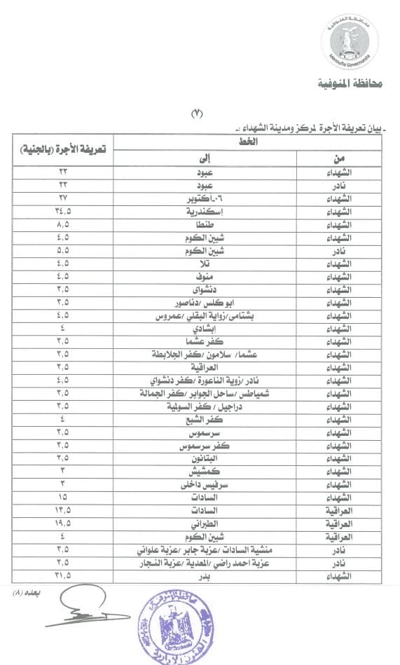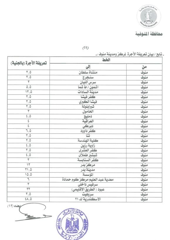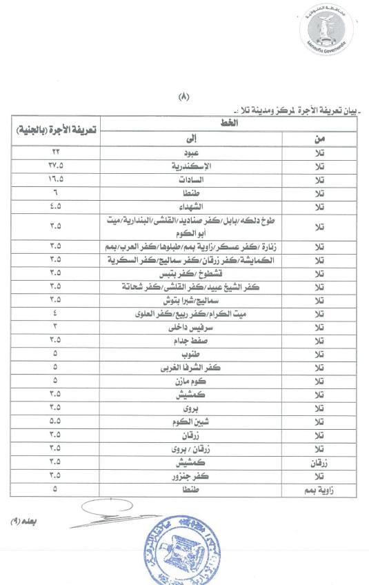 ووجه محافظ المنوفية رؤساء الوحدات المحلية للمراكز والمدن والأحياء بالتنسيق مع المرور والمتابعة الميدانية على مدار الساعة على محطات الوقود ومواقف السيارات للتأكد من الالتزام بالتعريفة الجديدة، ووضع لافتات وبنرات ظاهرة بالمواقف بتعريفة الركوب الجديدة لضمان التزام سائقي السيارات العاملة على الخطوط المختلفة بالتعريفة الجديدة.