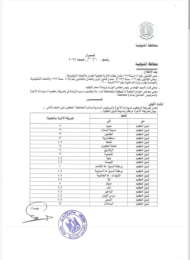 محافظة المنوفية تعلن أسعار تعريفة الركوب الجديدة لسيارات الأجرة