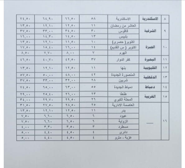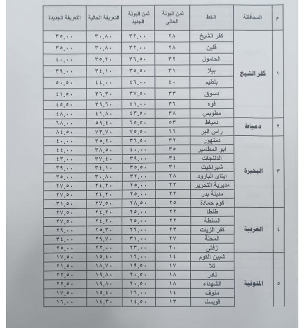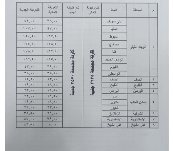 وجاءت أسعار تعريفة الركوب للوجهين القبلي والبحري والمدن الجديدة كالآتي: