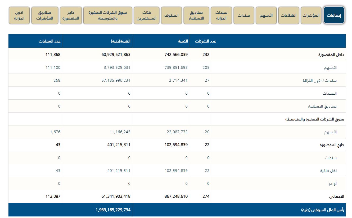 كما ارتفعت مؤشرات البورصة المصرية بختام تعاملات آخر جلسات الأسبوع ليسجل رأس المال السوقي نحو 1.897 تريليون جنيه، لتربح البورصة المصرية 42 مليار جنيه.