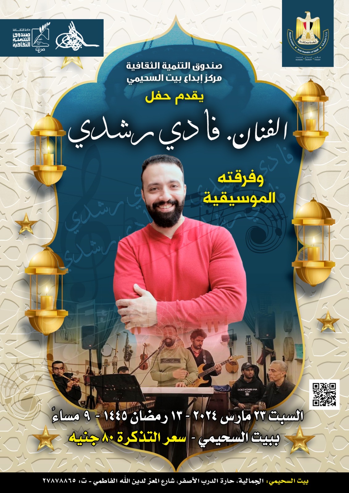 يقيم مركز إبداع بيت السحيمي، بشارع المعز، والتابع لقطاع صندوق التنمية الثقافية فى تمام التاسعة من مساء اليوم السبت ١٣ رمضان الموافق 23 مارس الجاري، حفلا غنائيا للمطرب فادي رشدي وفرقته الموسيقية.