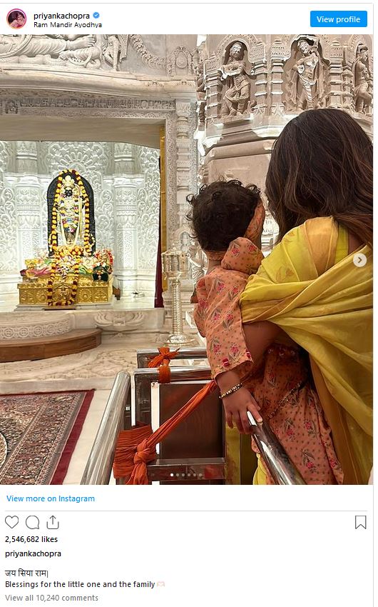 وأثارت صورة نشرتها الممثلة، خلال زيارتها معبد رام ماندير الهندوسي، في ولاية أوتار براديش، مع زوجها الأمريكي نيك جونز وطفلتهما مالتي ماري، الغضب بين المسلمين.