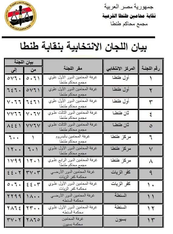 وجاء توزيع اللجان الانتخابية فى طنطا على النحو التالي، ٣ لمركز طنطا و٣ لمحامين أول طنطا، ولجنتين لمحامين ثان طنطا في مجمع محاكم طنطا ولجنتن في محكمة السنطة ولجنتين في نادي كفر الزيات الرياضي ولجنة بسيون.