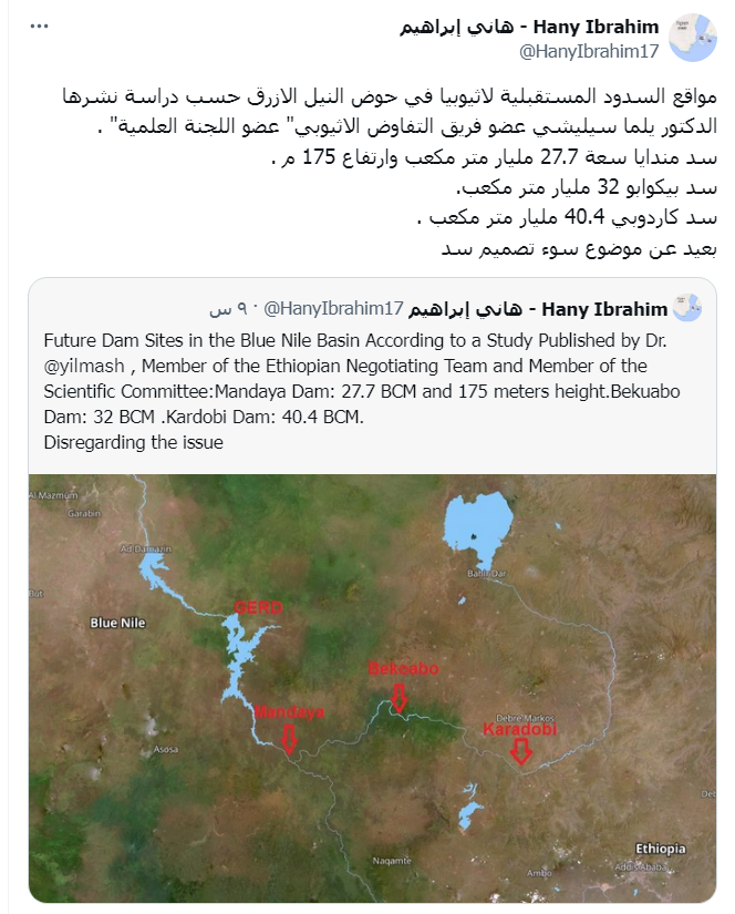 وقال هاني إبراهيم، عن سدود أثيوبيا الجديدة، التي كشفت عنها أثيوبيا: "مواقع السدود المستقبلية لأثيوبيا في حوض النيل الأزرق حسب دراسة نشرها الدكتور يلما سيليشي عضو فريق التفاوض الأثيوبي "عضو اللجنة العلمية"؛ سد مندايا سعة 27.7 مليار متر مكعب وارتفاع 175 م، سد بيكوابو 32 مليار متر مكعب. سد كاردوبي 40.4 مليار متر مكعب".