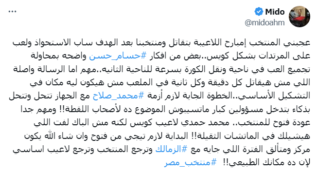 ووجه أحمد حسام ميدو رسالة لمدرب منتخب مصر: "بعض من أفكار حسام حسن واضحة بمحاولة تجميع اللعب في ناحية ونقل الكورة بسرعة للناحية الثانيه.. مهم أما الرسالة واصلة.. اللي مش هيقاتل كل دقيقة وكل ثانية في الملعب مش هيكون ليه مكان في التشكيل الأساسي..".