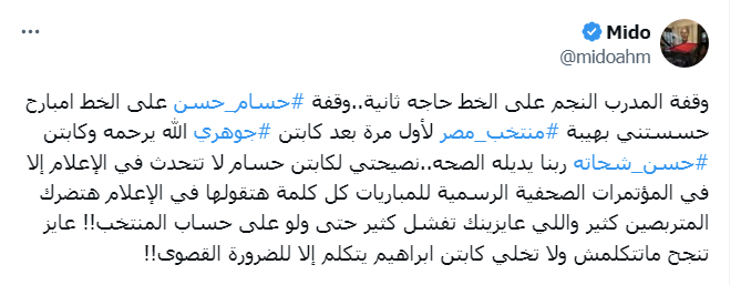 وأشار ميدو إلى أن "وقفة المدرب النجم على الخط حاجه ثانية.. وقفة #حسام_حسن على الخط امبارح حسستني بهيبة منتخب مصر لأول مرة بعد كابتن جوهري الله يرحمه وكابتن حسن شحاته ربنا يديله الصحة".