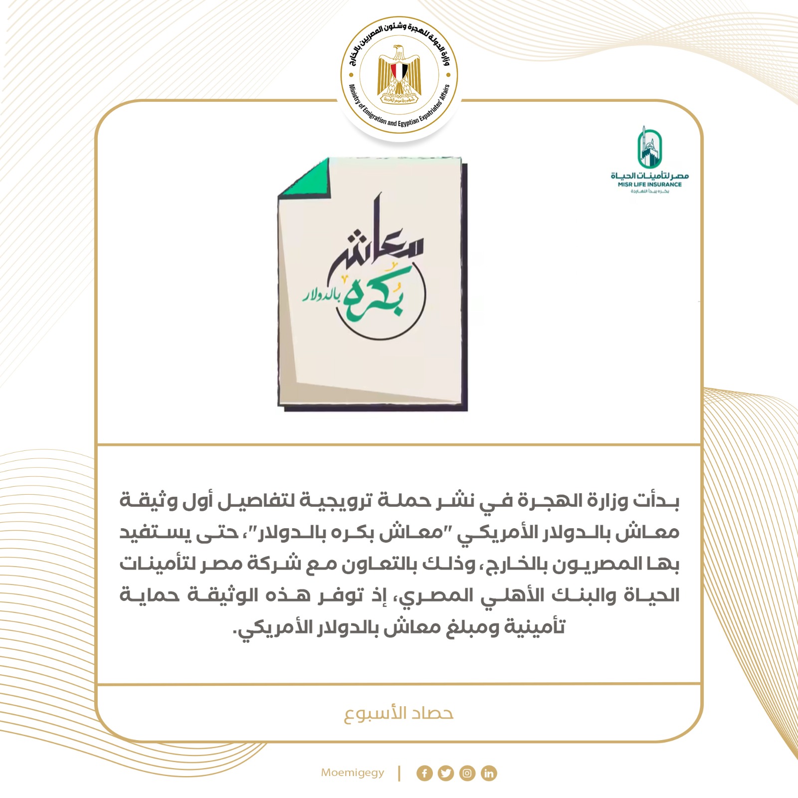 9- بدأت وزارة الهجرة في نشر حملة ترويجية لتفاصيل أول وثيقة معاش بالدولار الأمريكي "معاش بكره بالدولار"، حتى يستفيد بها المصريون بالخارج، وذلك بالتعاون مع شركة مصر لتأمينات الحياة والبنك الأهلي المصري، إذ توفر هذه الوثيقة حمایة تأمینیة ومبلغ معاش بالدولار الأمريكي.