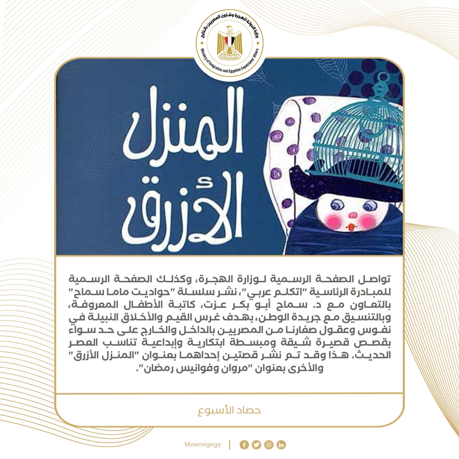 8- تواصل الصفحة الرسمية لوزارة الهجرة، وكذلك الصفحة الرسمية للمبادرة الرئاسية "اتكلم عربي"، نشر سلسلة "حواديت ماما سماح" بالتعاون مع د. سماح أبو بكر عزت، كاتبة الأطفال المعروفة، وبالتنسيق مع جريدة الوطن، بهدف غرس القيم والأخلاق النبيلة في نفوس وعقول صغارنا من المصريين بالداخل والخارج على حد سواء بقصص قصيرة شيقة ومبسطة ابتكارية وإبداعية تناسب العصر الحديث. هذا وقد تم نشر قصتين إحداهما بعنوان "المنزل الأزرق" والأخرى بعنوان "مروان وفوانيس رمضان".