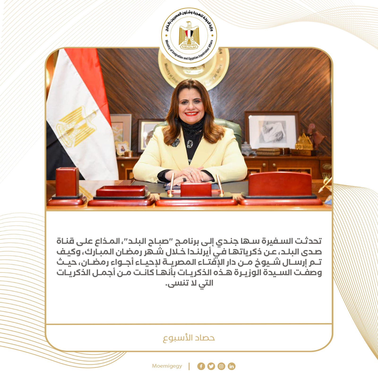 7- تحدثت السفيرة سها جندي إلى برنامج "صباح البلد"، المذاع على قناة صدى البلد، عن ذكرياتها في أيرلندا خلال شهر رمضان المبارك، وكيف تم إرسال شيوخ من دار الإفتاء المصرية لإحياء أجواء رمضان، حيث وصفت السيدة الوزيرة هذه الذكريات بأنها كانت من أجمل الذكريات التي لا تنسى.
