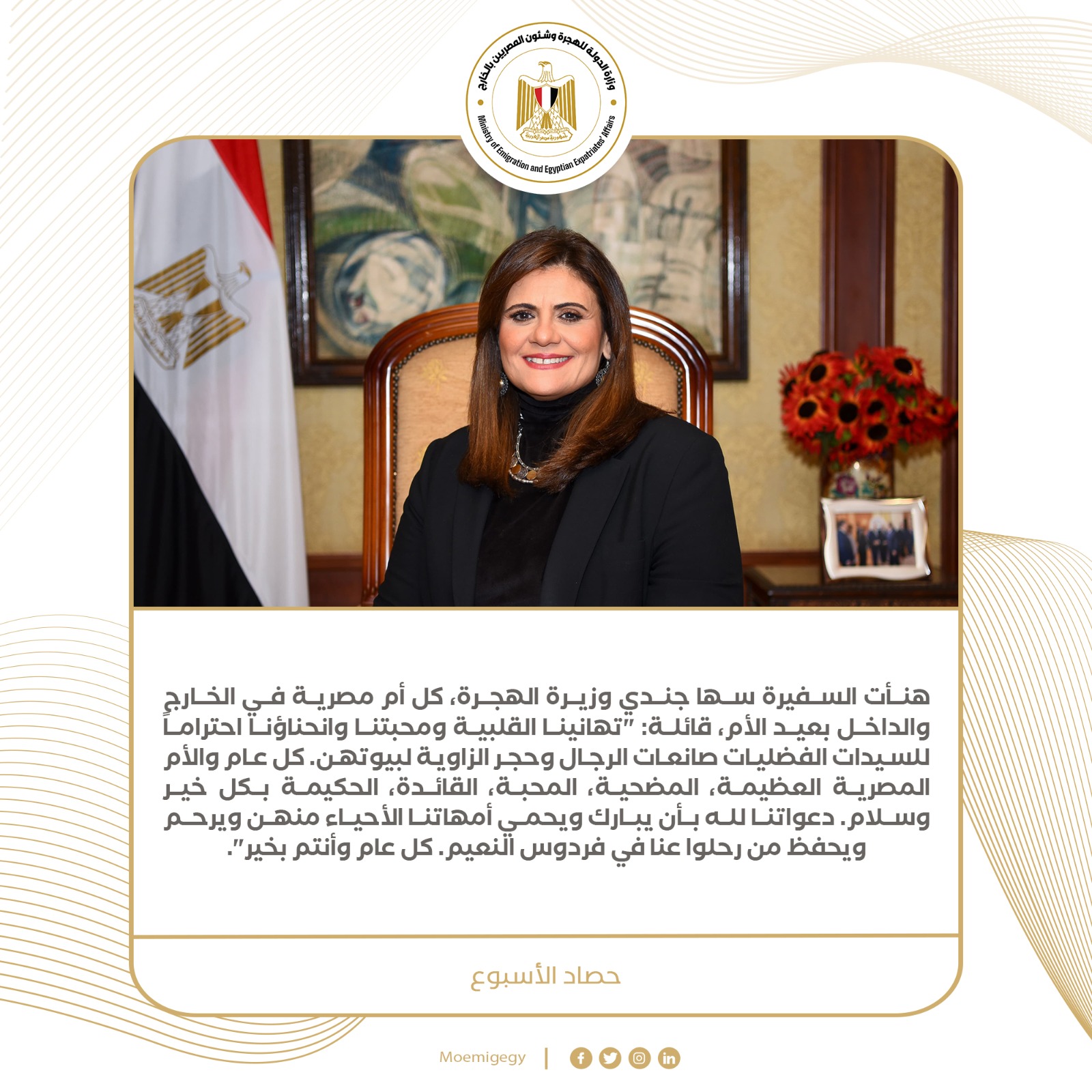 6- هنأت السفيرة سها جندي وزيرة الهجرة، كل أم مصرية في الخارج والداخل بعيد الأم، قائلة: "تهانينا القلبية ومحبتنا وانحناؤنا احترامًا للسيدات الفضليات صانعات الرجال وحجر الزاوية لبيوتهن. كل عام والأم المصرية العظيمة، المضحية، المحبة، القائدة، الحكيمة بكل خير وسلام. دعواتنا لله بأن يبارك ويحمي أمهاتنا الأحياء منهن ويرحم ويحفظ من رحلوا عنا في فردوس النعيم. كل عام وأنتم بخير".