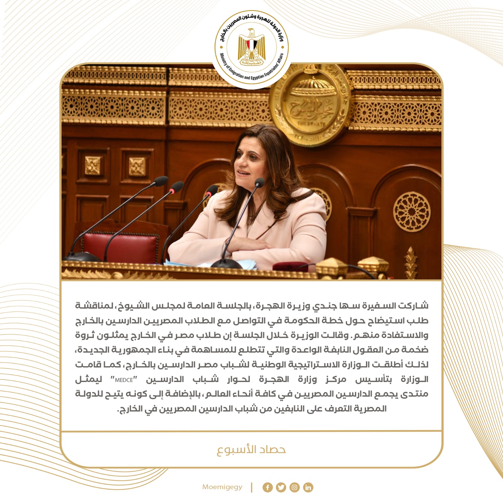 3- شاركت السفيرة سها جندي وزيرة الهجرة، بالجلسة العامة لمجلس الشيوخ، لمناقشة طلب استيضاح حول خطة الحكومة في التواصل مع الطلاب المصريين الدارسين بالخارج والاستفادة منهم. وقالت الوزيرة خلال الجلسة إن طلاب مصر في الخارج يمثلون ثروة ضخمة من العقول النابغة الواعدة والتي تتطلع للمساهمة في بناء الجمهورية الجديدة، لذلك أطلقت الوزارة الاستراتيجية الوطنية لشباب مصر الدارسين بالخارج، كما قامت الوزارة بتأسيس مركز وزارة الهجرة لحوار شباب الدارسين "MEDCE" ليمثل منتدى يجمع الدارسين المصريين في كافة أنحاء العالم، بالإضافة إلى كونه يتيح للدولة المصرية التعرف على النابغين من شباب الدارسين المصريين في الخارج.