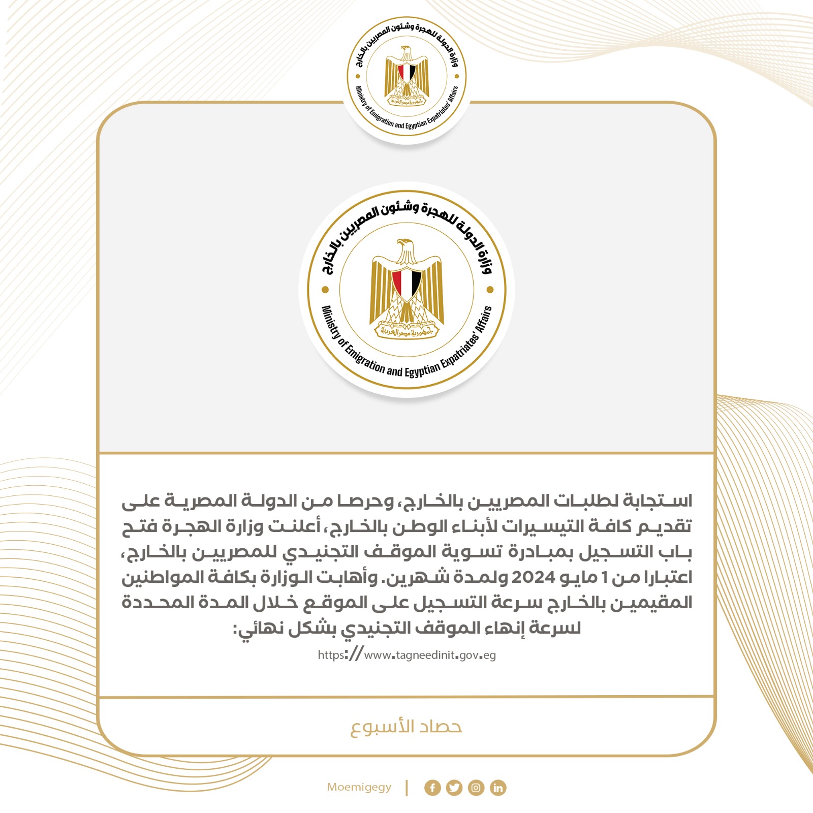 4- استجابة لطلبات المصريين بالخارج، وحرصًا من الدولة المصرية على تقديم كافة التيسيرات لأبناء الوطن بالخارج، أعلنت وزارة الهجرة فتح باب التسجيل بمبادرة تسوية الموقف التجنيدي للمصريين بالخارج، اعتبارًا من ١ مايو ٢٠٢٤ ولمدة شهرين. وأهابت الوزارة بكافة المواطنين المقيمين بالخارج سرعة التسجيل على الموقع خلال المدة المحددة لسرعة إنهاء الموقف التجنيدي بشكل نهائي: