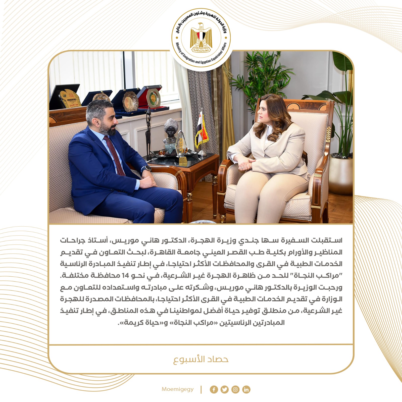 5- استقبلت السفيرة سها جندي وزيرة الهجرة، الدكتور هاني موريس، أستاذ جراحات المناظير والأورام بكلية طب القصر العيني جامعة القاهرة، لبحث التعاون في تقديم الخدمات الطبية في القرى والمحافظات الأكثر احتياجا، في إطار تنفيذ المبادرة الرئاسية "مراكب النجاة" للحد من ظاهرة الهجرة غير الشرعية، في نحو 14 محافظة مختلفة. ورحبت الوزيرة بالدكتور هاني موريس، وشكرته على مبادرته واستعداده للتعاون مع الوزارة في تقديم الخدمات الطبية في القرى الأكثر احتياجا، بالمحافظات المصدرة للهجرة غير الشرعية، من منطلق توفير حياة أفضل لمواطنينا في هذه المناطق، في إطار تنفيذ المبادرتين الرئاسيتين «مراكب النجاة» و«حياة كريمة».