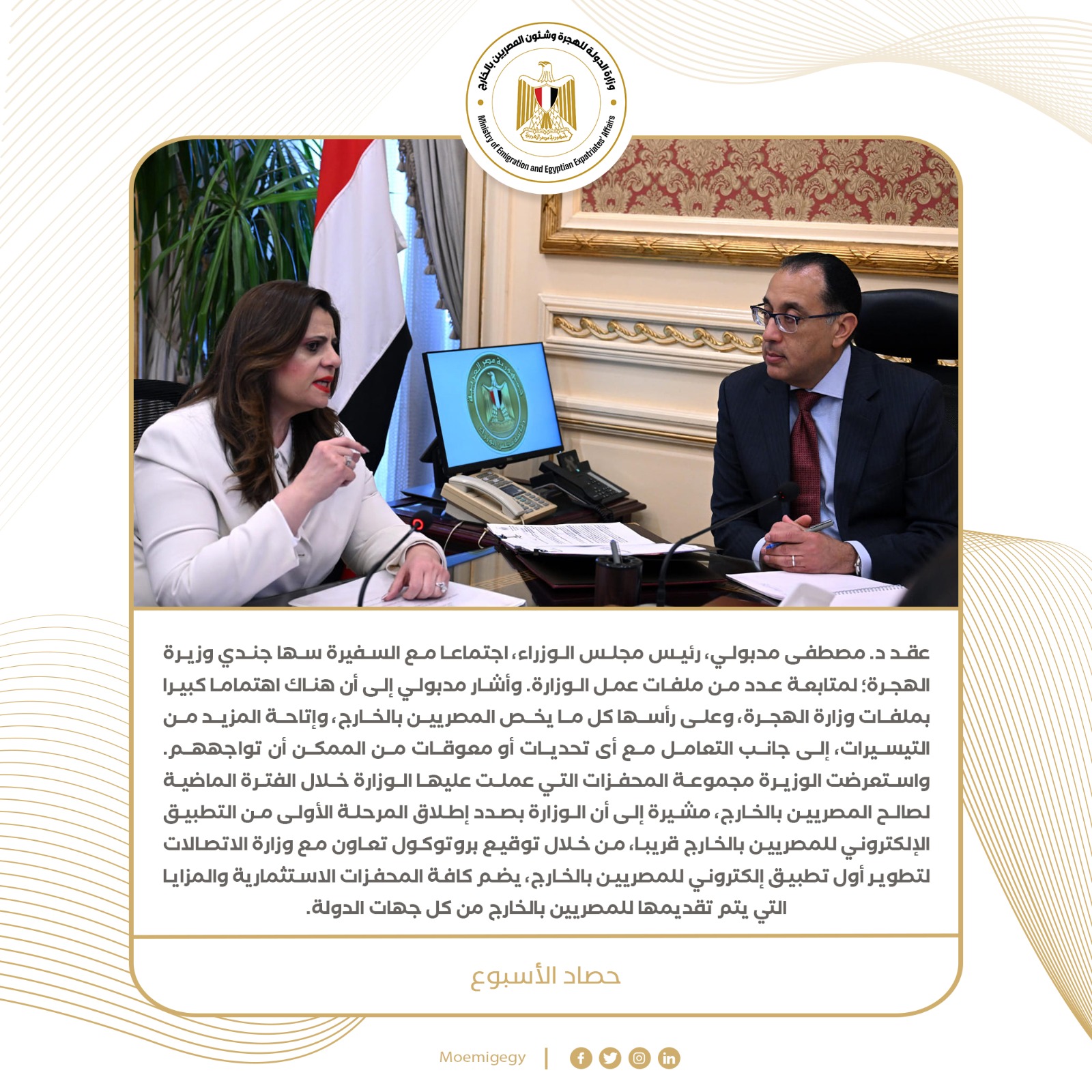 1- عقد الدكتور مصطفى مدبولي، رئيس مجلس الوزراء، اجتماعًا مع السفيرة سها جندي وزيرة الهجرة؛ لمتابعة عدد من ملفات عمل الوزارة.