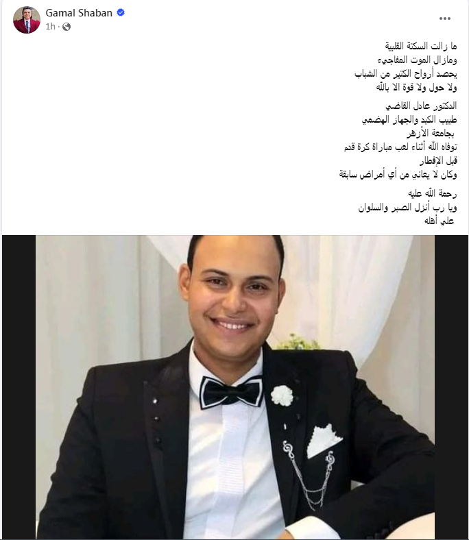 وتابع جمال شعبان: "الدكتور عادل القاضي طبيب الكبد والجهاز الهضمي بجامعة الأزهر، توفاه الله أثناء لعب مباراة كرة قدم قبل الإفطار، وكان لا يعاني من أي أمراض سابقة، رحمة الله عليه.. ويا رب انزل الصبر والسلوان علي أهله".