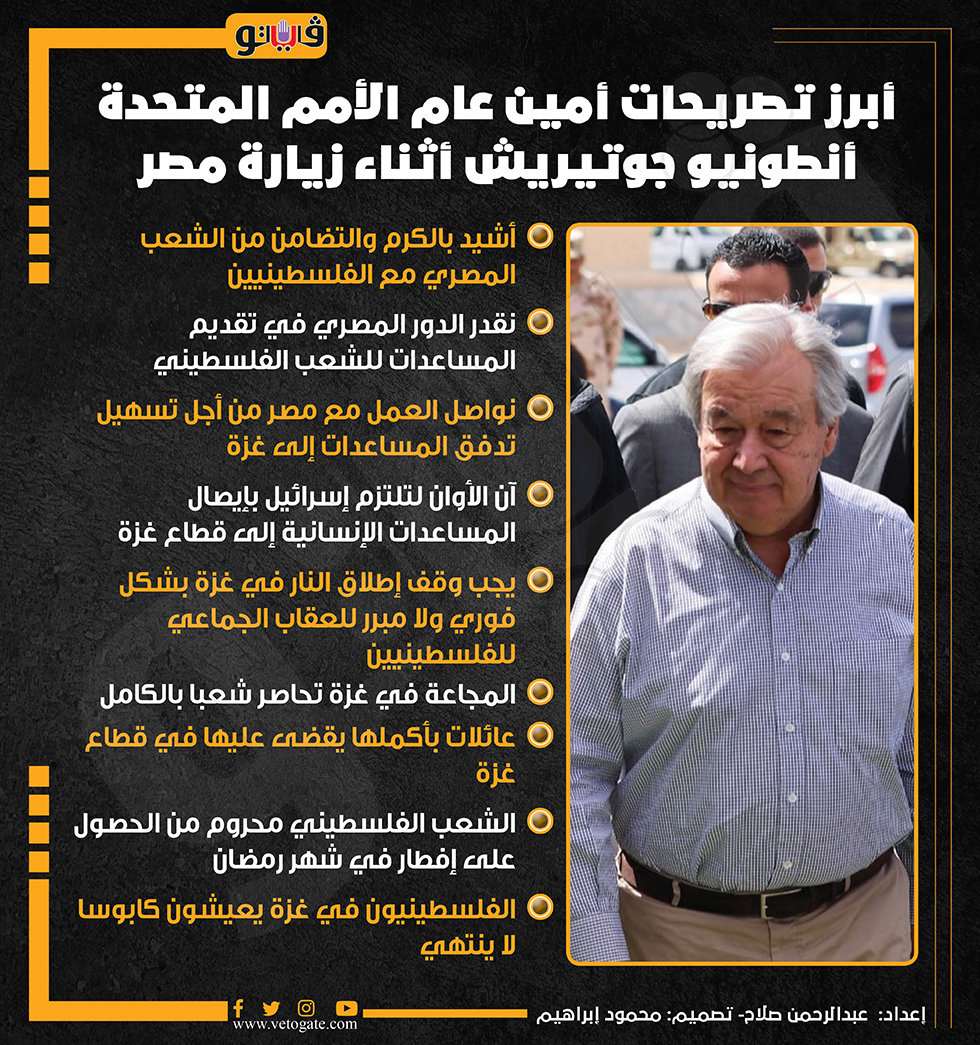 أبرز تصريحات أمين عام الأمم المتحدة أنطونيو جوتيريش أثناء زيارة مصر (إنفوجراف) السبت 23/مارس/2024 - 08:53 م 3/23/2024 8:53:48 PM جوتيريش، فيتو عبدالرحمن صلاح شارك طباعة 18 حجم الخط شارك طباعة جوتيريش الأمم المتحدة امين عام الامم المتحدة طوفان الأقصى أنطونيو جوتيريش فلسطين