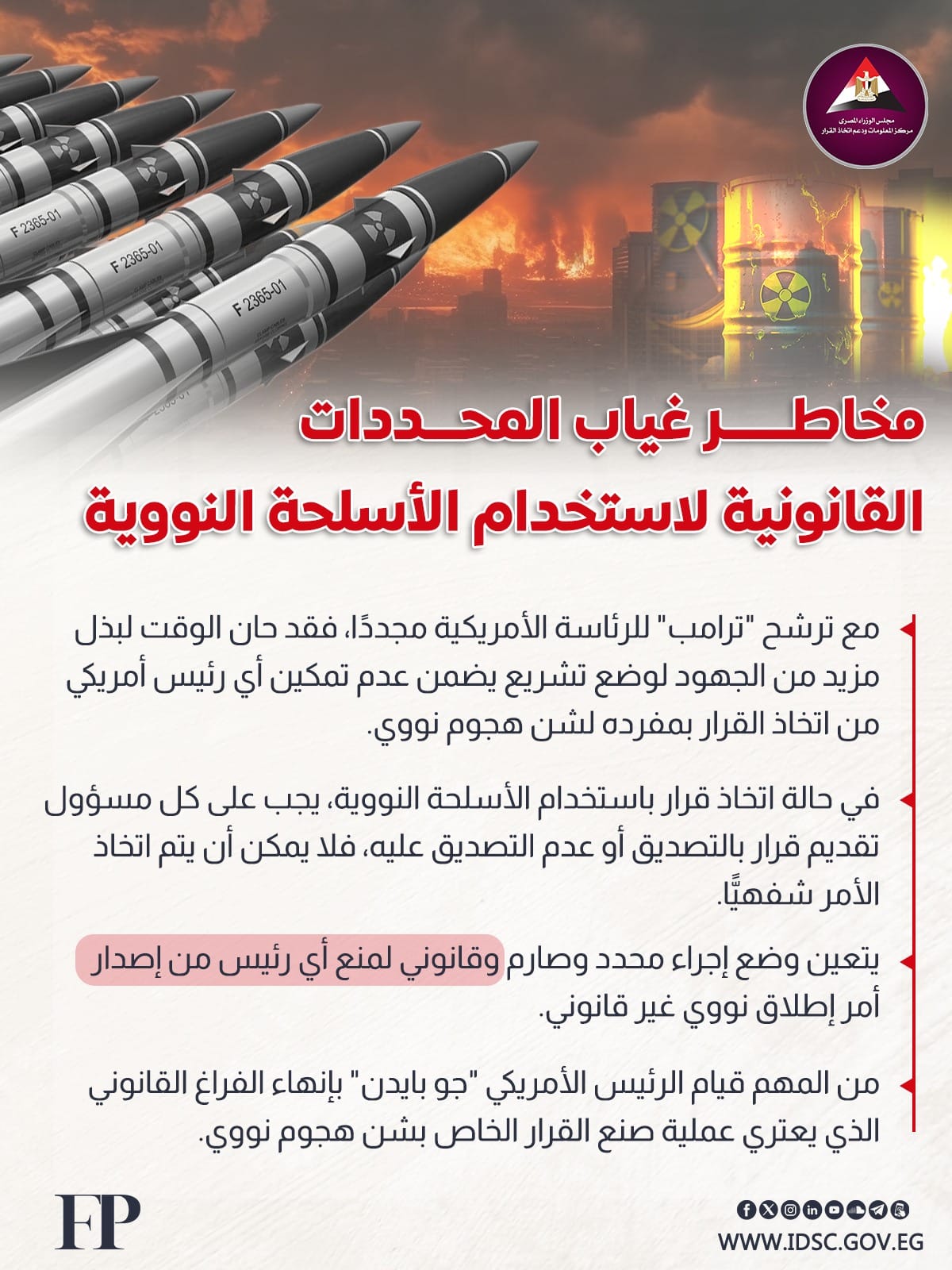 كشفت الصفحة الرسمية لمركز المعلومات ودعم اتخاذ القرار بمجلس الوزراء على موقع التواصل الاجتماعي "فيسبوك" عن مخاطر غياب المحددات القانونية لاستخدام الأسلحة النووية.