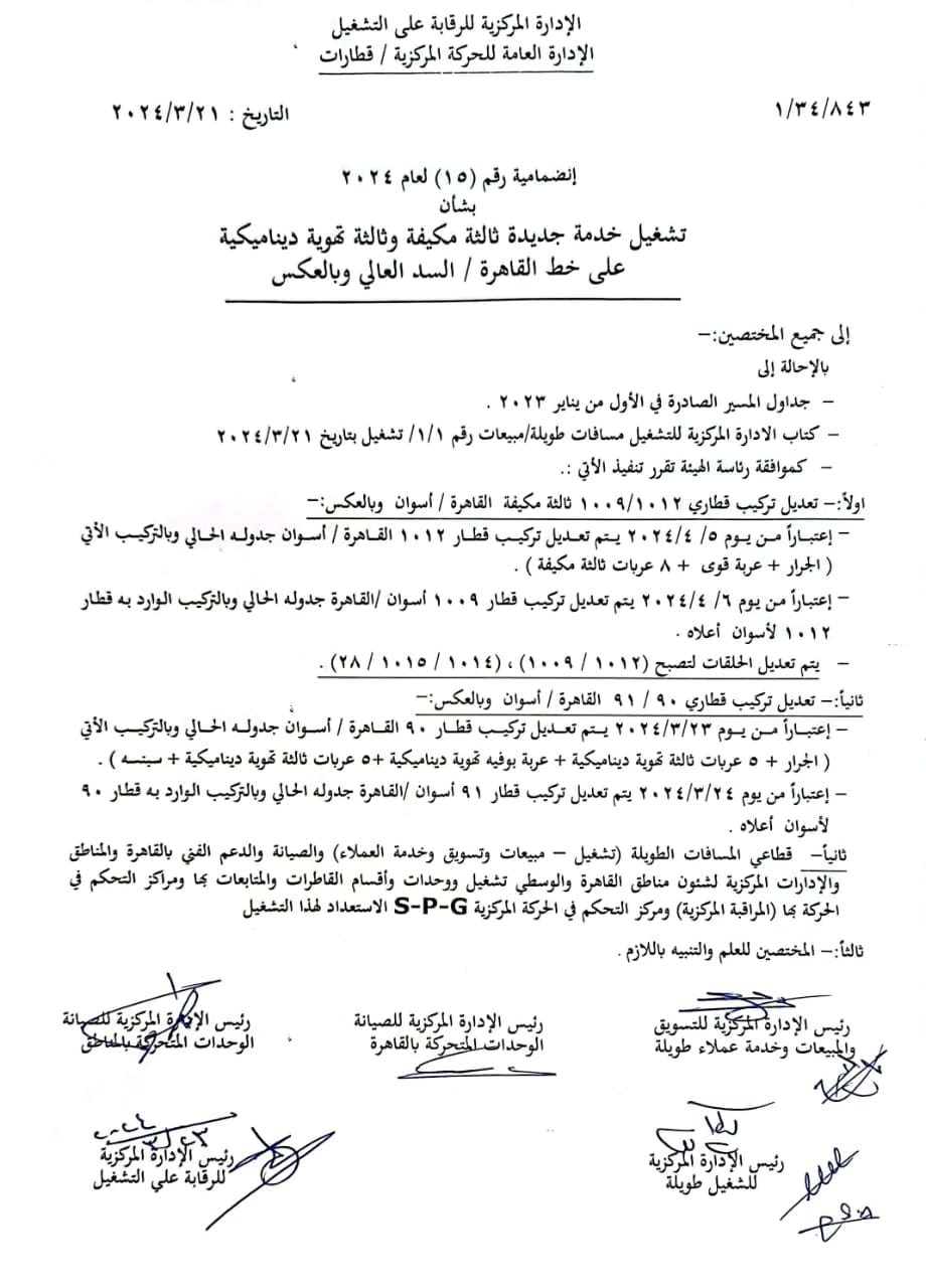 قررت الهيئة القومية للسكك الحديد تعديل بعض القطارات بداية من 4 أبرايل المقبل وهى قطار القاهرة أسوان وتعديل تركيب قطار أسوان القاهرة وتأتى خطط تعديل بعض المواعيد فى إطار الاستعدادات لعيد الفطر المبارك