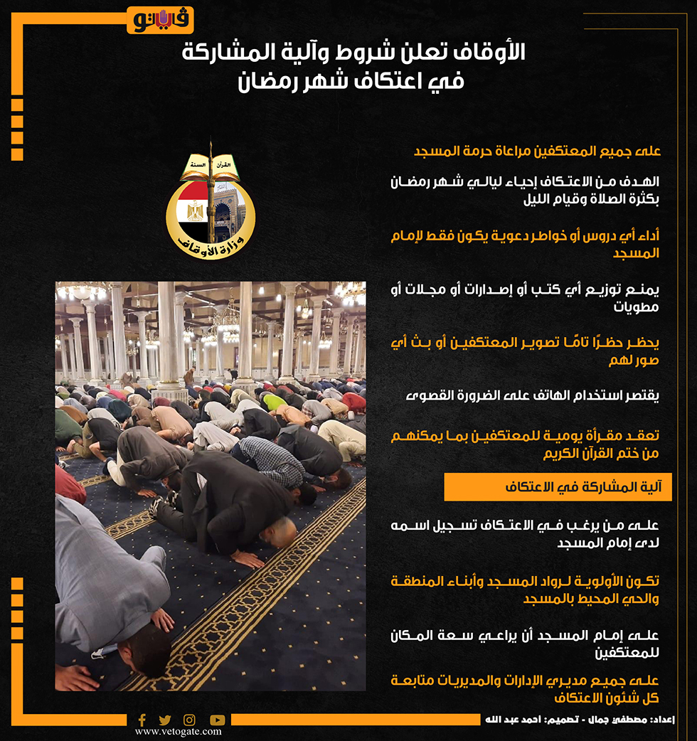 الأوقاف تعلن شروط وآلية المشاركة في اعتكاف شهر رمضان (إنفوجراف) الأحد 24/مارس/2024 - 01:24 م 3/24/2024 1:24:42 PM مصطفى جمال شارك طباعة 18 حجم الخط شارك طباعة الأوقاف اعتكاف شهر رمضان شهر رمضان ليالي شهر رمضان القرآن الكريم قيام الليل