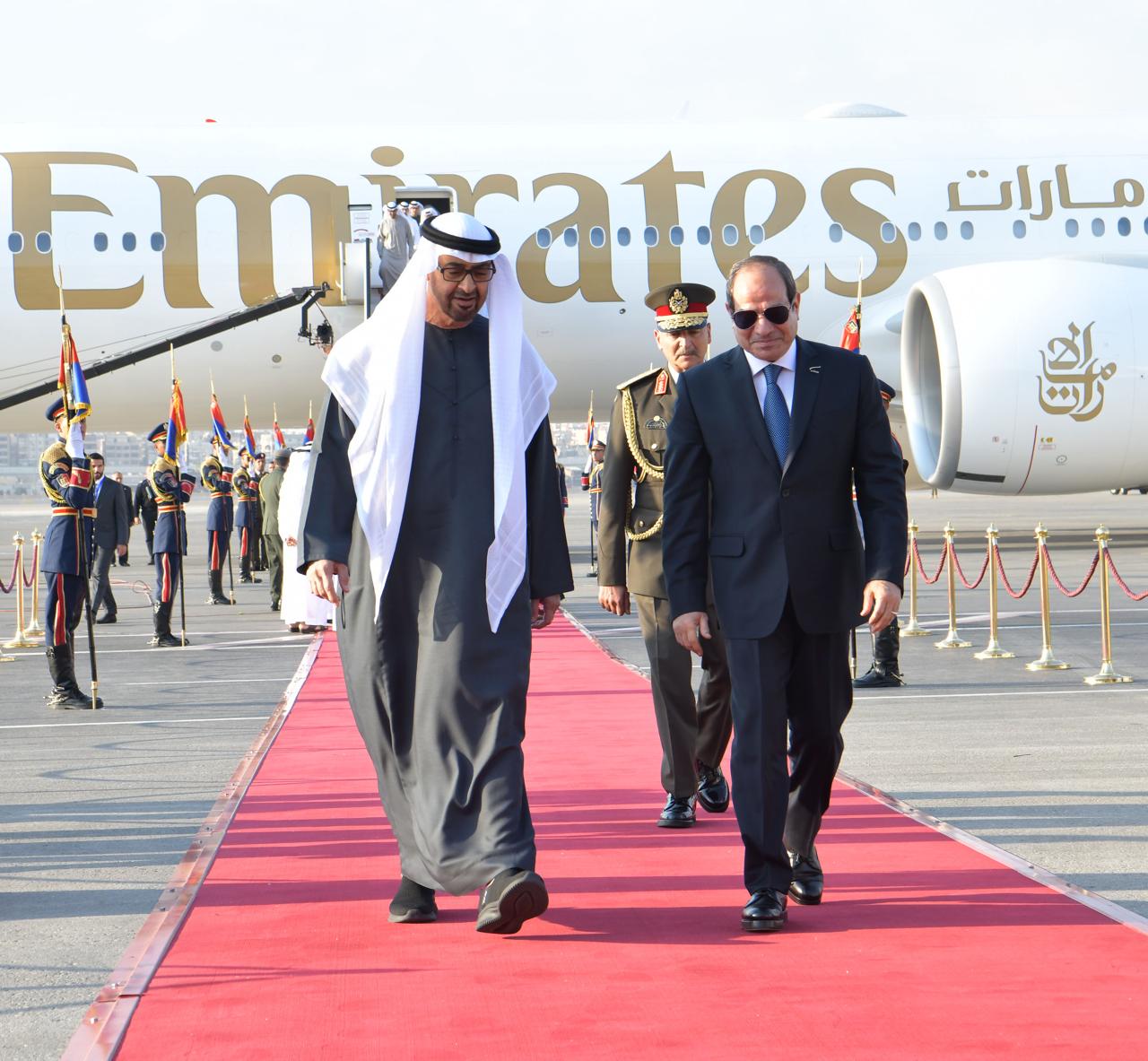 وعقب انتهاء المباحثات حرص الرئيس عبد الفتاح السيسي علي توديع اخيه الشيخ محمد بن زايد ال نهيان رئيس دولة الامارات من مطار القاهرة الدولي
