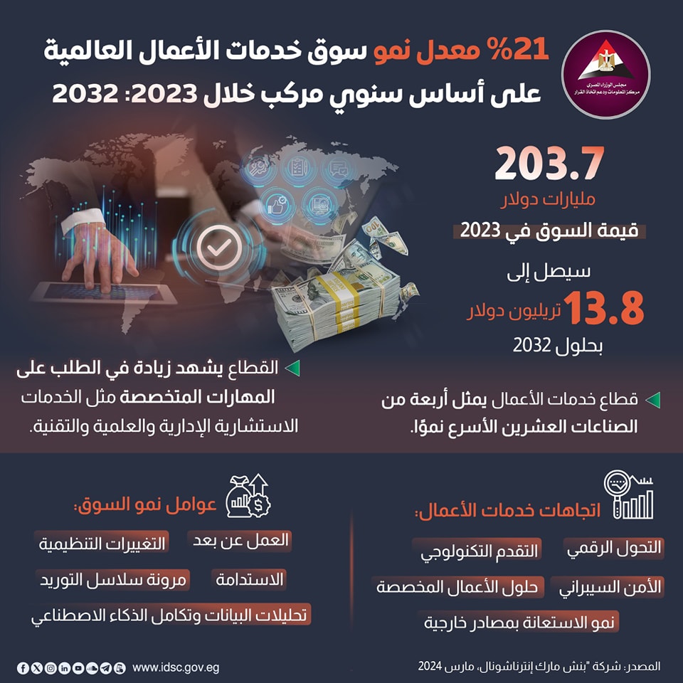 كشفت الصفحة الرسمية لمركز المعلومات ودعم اتخاذ القرار بمجلس الوزراء على موقع التواصل الاجتماعي "فيسبوك" عن معدل نمو سوق خدمات الأعمال العالمية على أساس سنوي مركب خلال 2023: 2032.