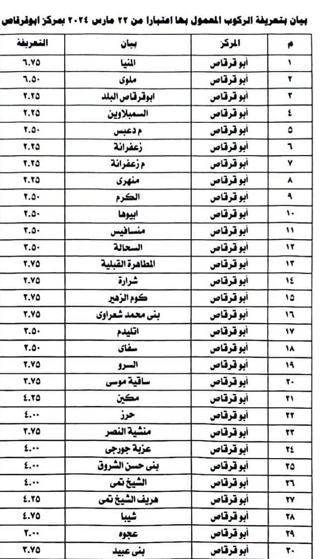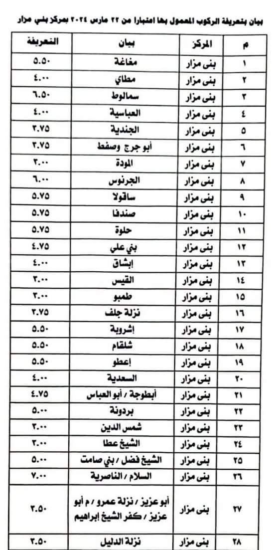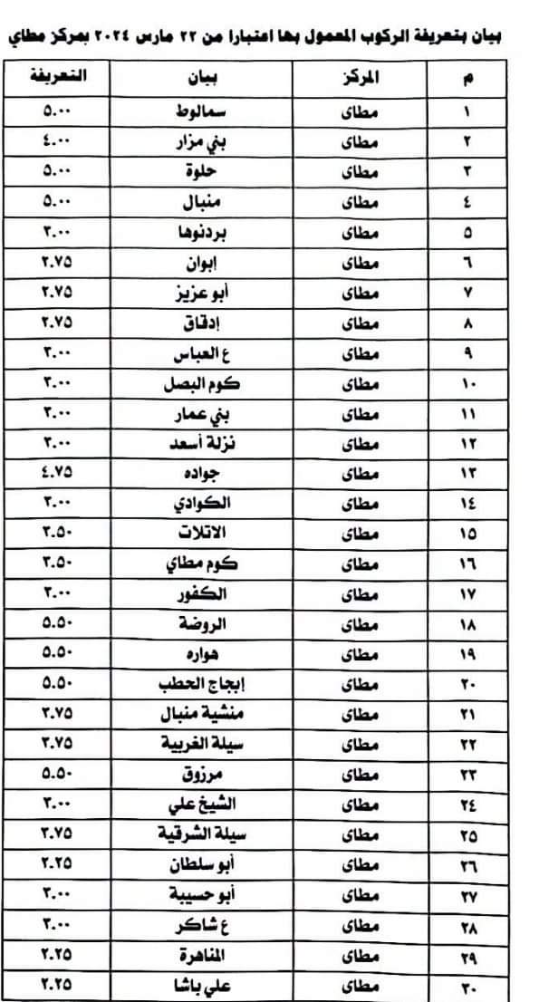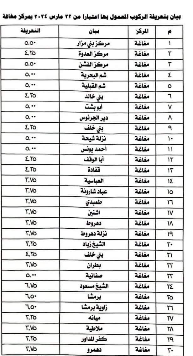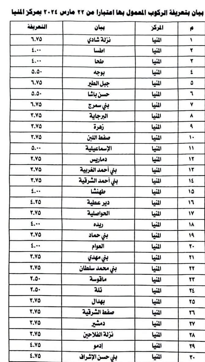 تعريفة الركوب الجديدة للقرى ومراكز المنيا