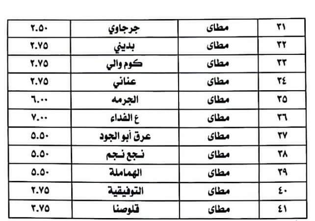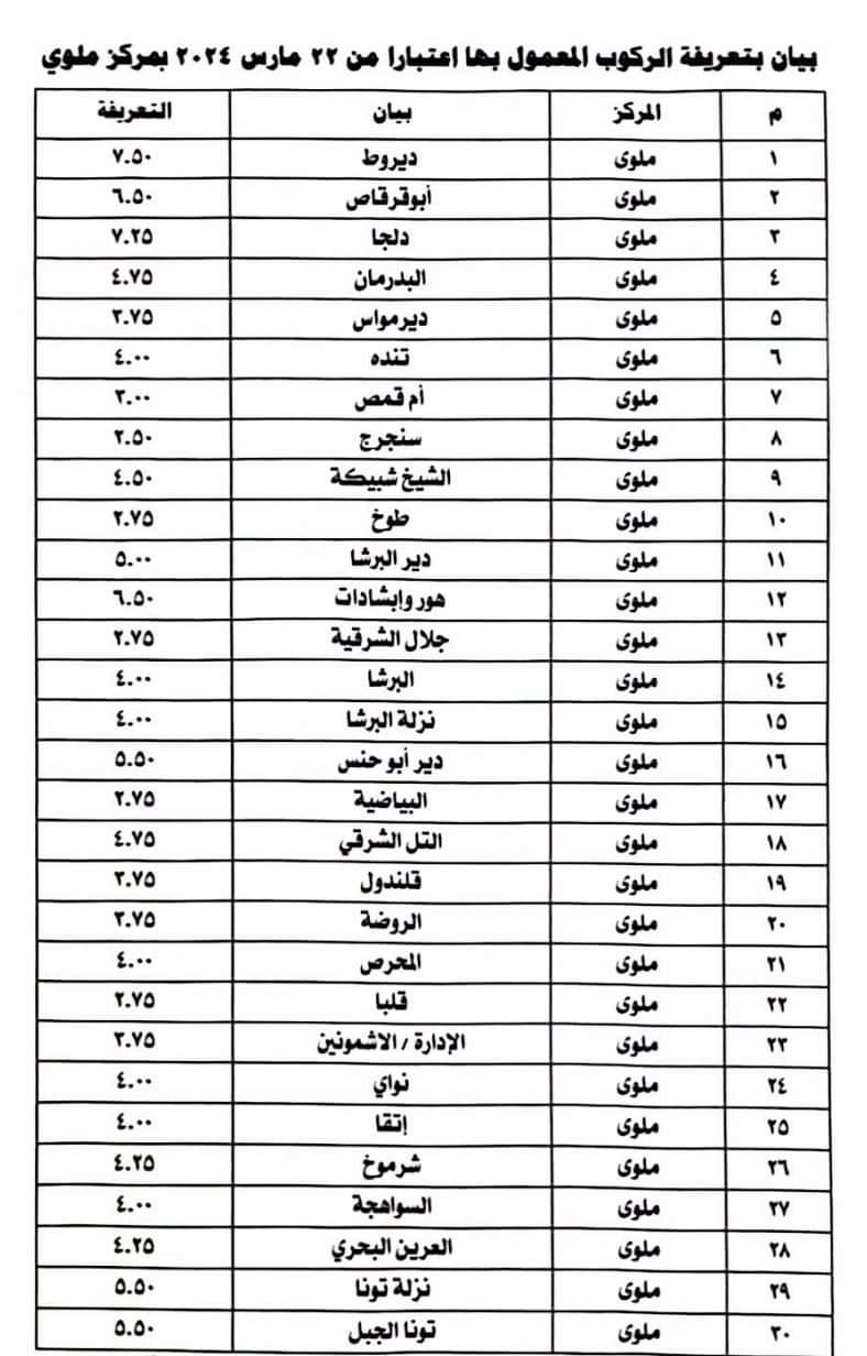 وجاءت الأسعار الجديدة للتعريفة بناءً على المسافة المقطوعة من مدينة ملوي جنوب محافظة المنيا إلى القرى والمحافظات المجاورة.
