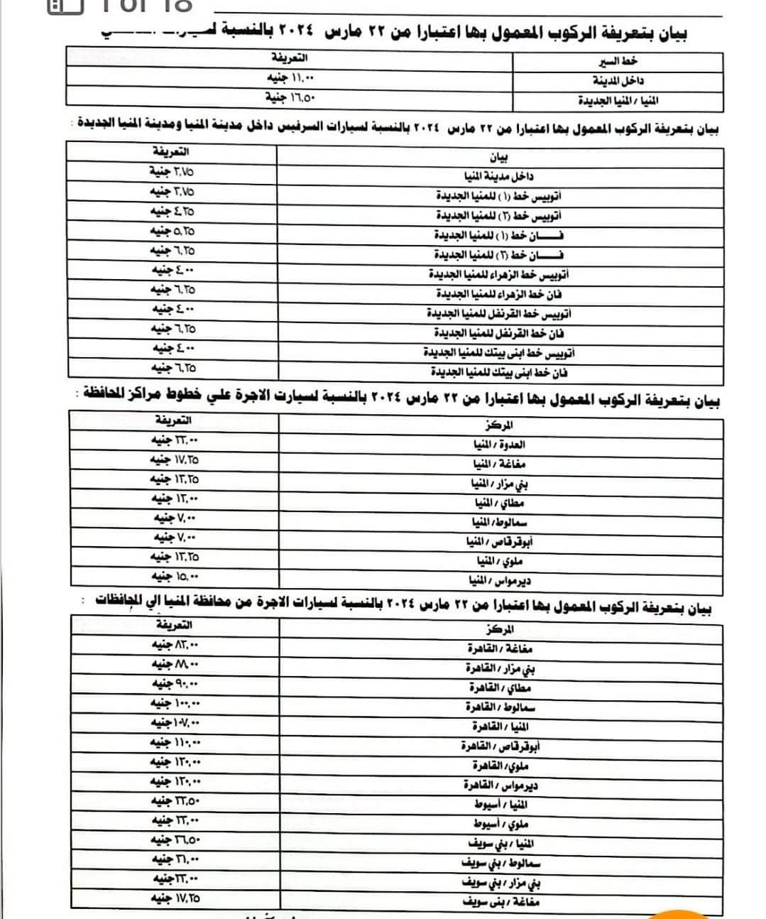 وقد نشرت الصفحة الرسمية لمحافظة المنيا عبر حسابها الشخصي على مواقع التواصل الاجتماعي "فيس بوك " بيانا بتعريفة ركوب السيارات بمدن ومراكز المحافظة.