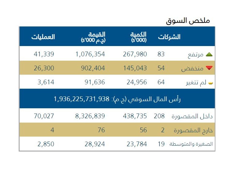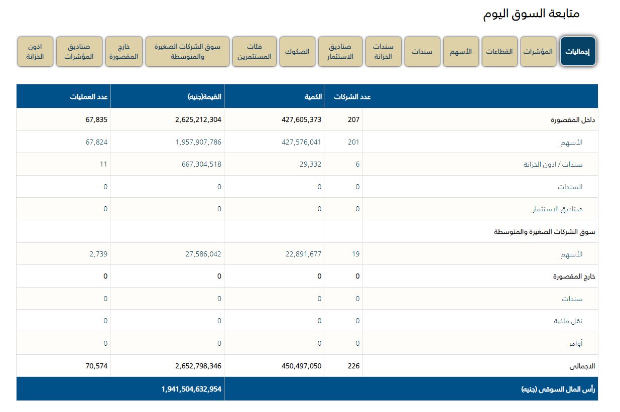 هبط مؤشر "إيجي إكس 30" بنسبة 0.09 % عند مستوى 29.027.67 نقطة وارتفع مؤشر الشركات الصغيرة والمتوسطة "إيجي إكس 70 متساوي الأوزان" بنسبة 1.42 % عند مستوى 6.689.84 نقطة.