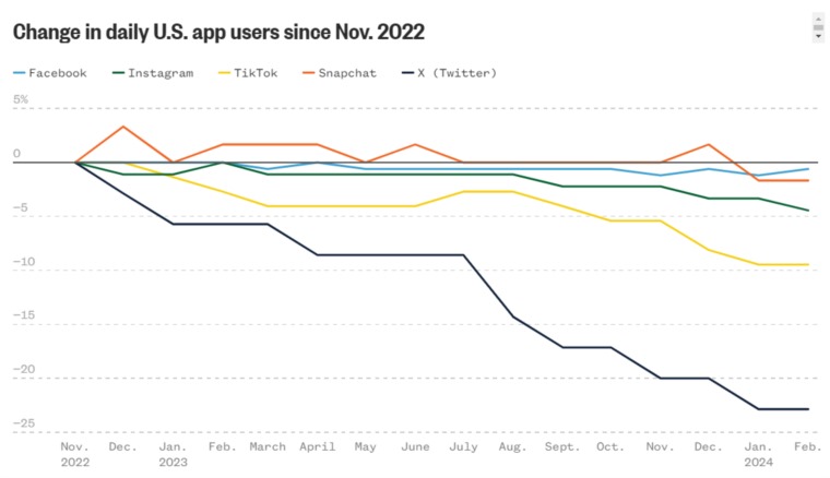 فخلال فبراير، كان لدى إكس 27 مليون مستخدم نشط يوميًا لتطبيق المنصة على الهاتف داخل أمريكا، بانخفاض 18% عن العام السابق، وفقًا لدراسة شركة Sensor Tower الأمريكية. وظلت قاعدة المستخدمين في أمريكا تنخفض كل شهر منذ نوفمبر 2022.