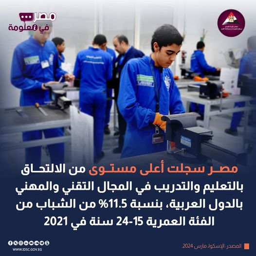 احتلت مصر المرتبة الأعلى عربيا في الالتحاق بالتعليم والتدريب في المجال التقني والمهني بـ 11.5% من الشباب من الفئة العمرية 15-24 سنة في 2021، يليها المغرب بنسبة 5.8 % في 2022، في حين ينخفض هذا المعدل إلى مستويات مقلقة في الإمارات والجزائر وجزر القمر وعمان وقطر والكويت وموريتانيا واليمن وذلك وفقا للإسكوا.