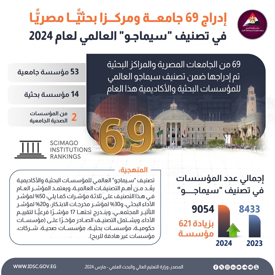 كشفت الصفحة الرسمية لمركز المعلومات ودعم اتخاذ القرار بمجلس الوزراء على موقع التواصل الاجتماعي "فيسبوك" عن إدراج 69 جامعة ومركزا بحثيا مصريا في تصنيف "سيماجو" العالمي لعام 2024.