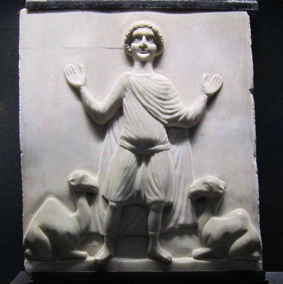 وجاءت القطعة الأولي للوحة رخامية مصور عليها بالنحت البارز القديس سانت مينا واقفا بين جملين رابضين من العصر البيزنطي.