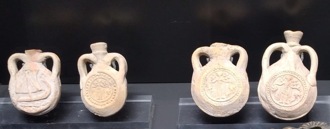 وجاءت القطعة الثالثة، لقنينات القديس مينا وهي قنينات فخارية لتخزين المياه المباركة التي نبعت من عين بجانب قبر القديس مينا، يظهر عليها القديس واقفا بين جملين، وتعود للقرن السادس إلى السابع الميلادي.