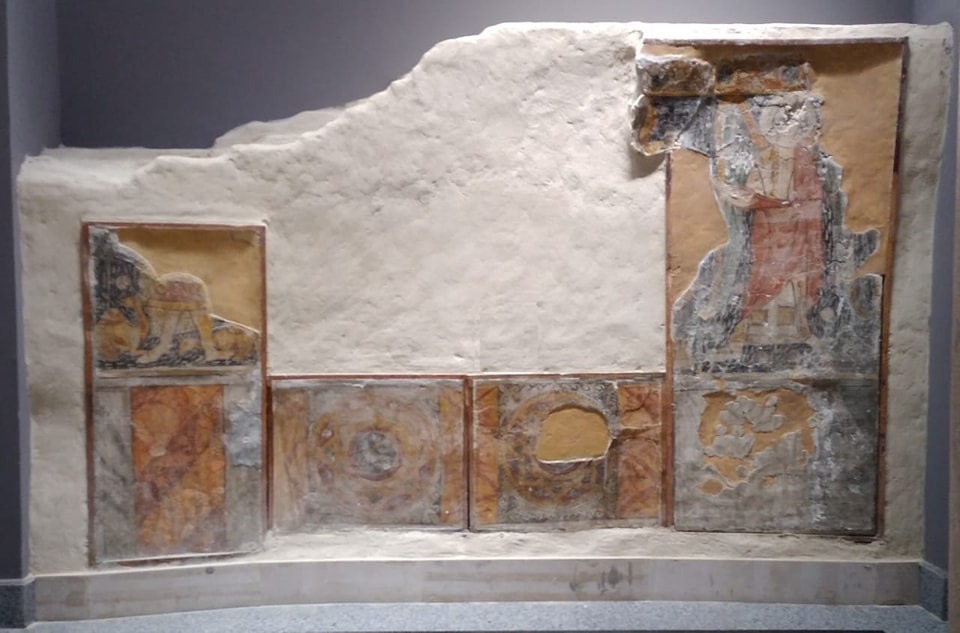 واما القطعة الثانية فهي رسم جداري بطريقة الفريسكو، وهو رسم جداري منفذ بطريقة الفريسكو أي الجص الملون، ويحمل زخارف وبعض الصور منها، منظر للقديس مينا بين الجملين، وقديس محاط بهالة من النور، وتعود للعصر البيزنطي أيضا.