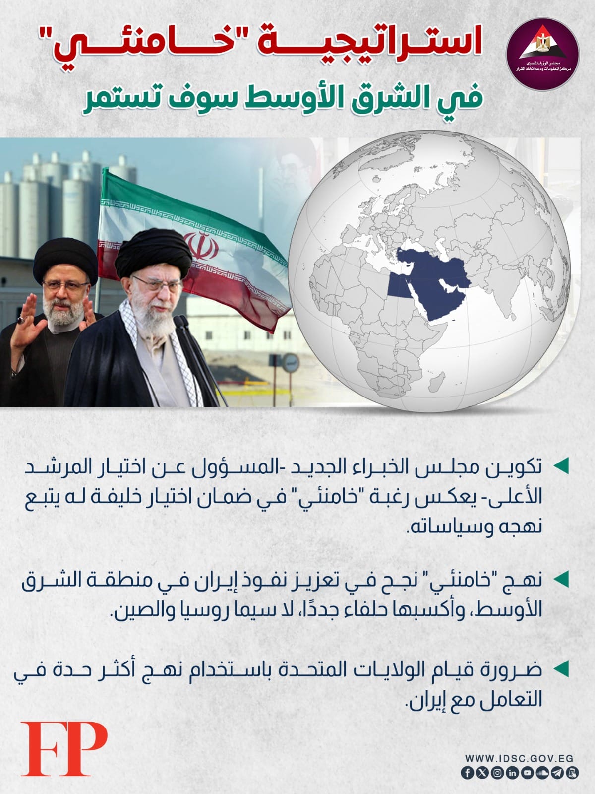 كشفت الصفحة الرسمية لمركز المعلومات ودعم اتخاذ القرار بمجلس الوزراء على موقع التواصل الاجتماعي "فيسبوك" استراتيجية خامنئي في الشرق الأوسط سوف تستمر.