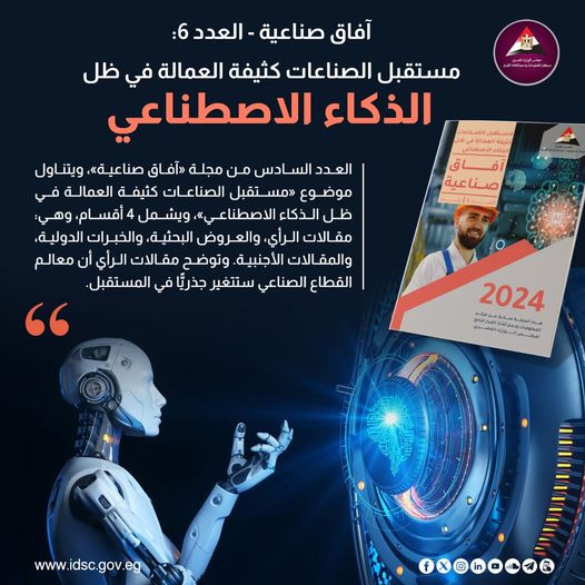 كشفت الصفحة الرسمية لمركز المعلومات ودعم اتخاذ القرار بمجلس الوزراء عن العدد السادس من مجلة «آفاق صناعية»، حيث سلط العدد الضوء على موضوع «مستقبل الصناعات كثيفة العمالة في ظل الذكاء الاصطناعي».