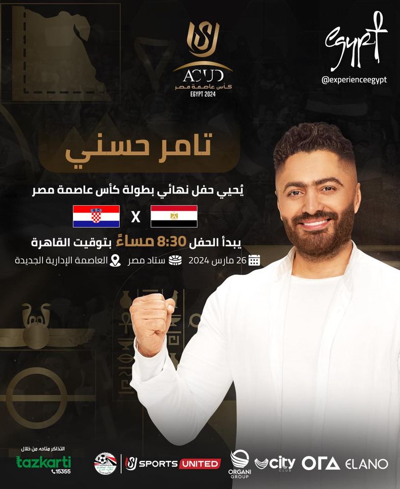 ويُحيي الفنان الكبير تامر حسني حفل نهائي كأس عاصمة مصر بين مصر وكرواتيا، في إستاد مصر بالعاصمة الإدارية الجديدة، البطولة التي تُنظم بواسطة الشركة المتحدة للرياضة وهي النسخة الأولى من سلسلة FIFA Series.