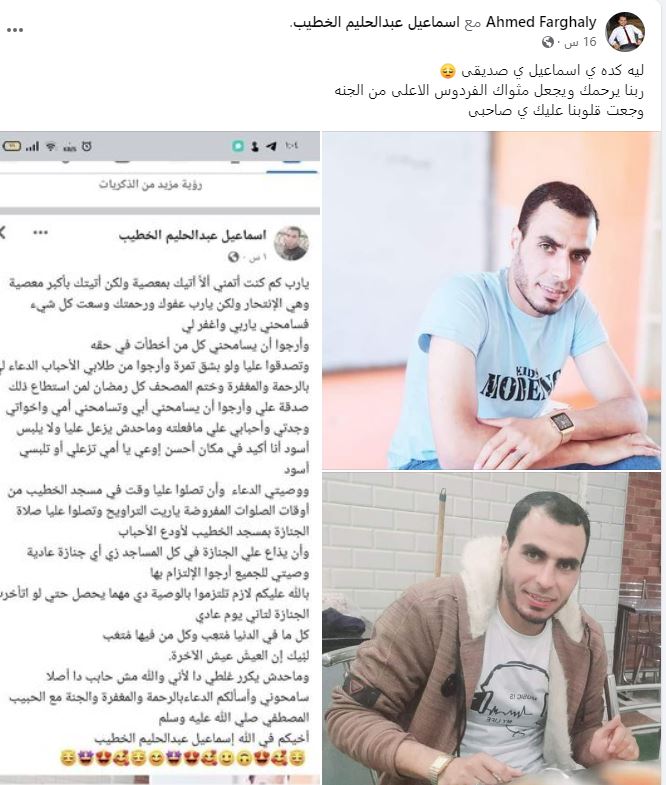 وتابع صديق له: "ليه بس كدا يا شيخ إسماعيل عبد الحليم الخطيب أنت قدوة لزمايلنا اللي في الجيش عمري ما أنسى استقبالك ليَّ في الكتيبة وكلامك معايا وكنت دايمًا تهون عليَّ إيه اللي وصلك للمرحلة دي بس وجعت قلوبنا عليك والله يا خويا شكرًا ع كل اللي عملته معايا شكرًا على سؤالك عليَّ بعد ما خلصت جيش وسبتنا ربنا يرحمك ويغفر لك ويجعلك في الجنة إن شاء الله".